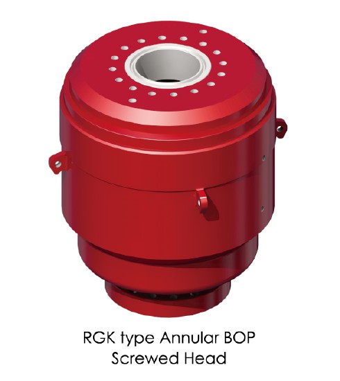 锥形胶芯环形防喷器关井动作时,来自液控系统的压力油进入下油腔(关闭油腔)推动活塞迅速上移,胶芯受顶盖的限制不能上移,在活塞内锥面的作用下被迫向井眼中心挤压紧缩、环抱钻具,封闭井口环形空间。当井内无钻具时,胶芯向中心挤压、紧缩直至胶芯中空部位填满橡胶为止,从而全封井口。同时上油腔里的液压油通过液控系统管路流回油箱。